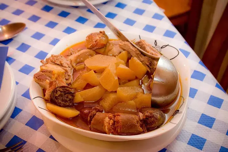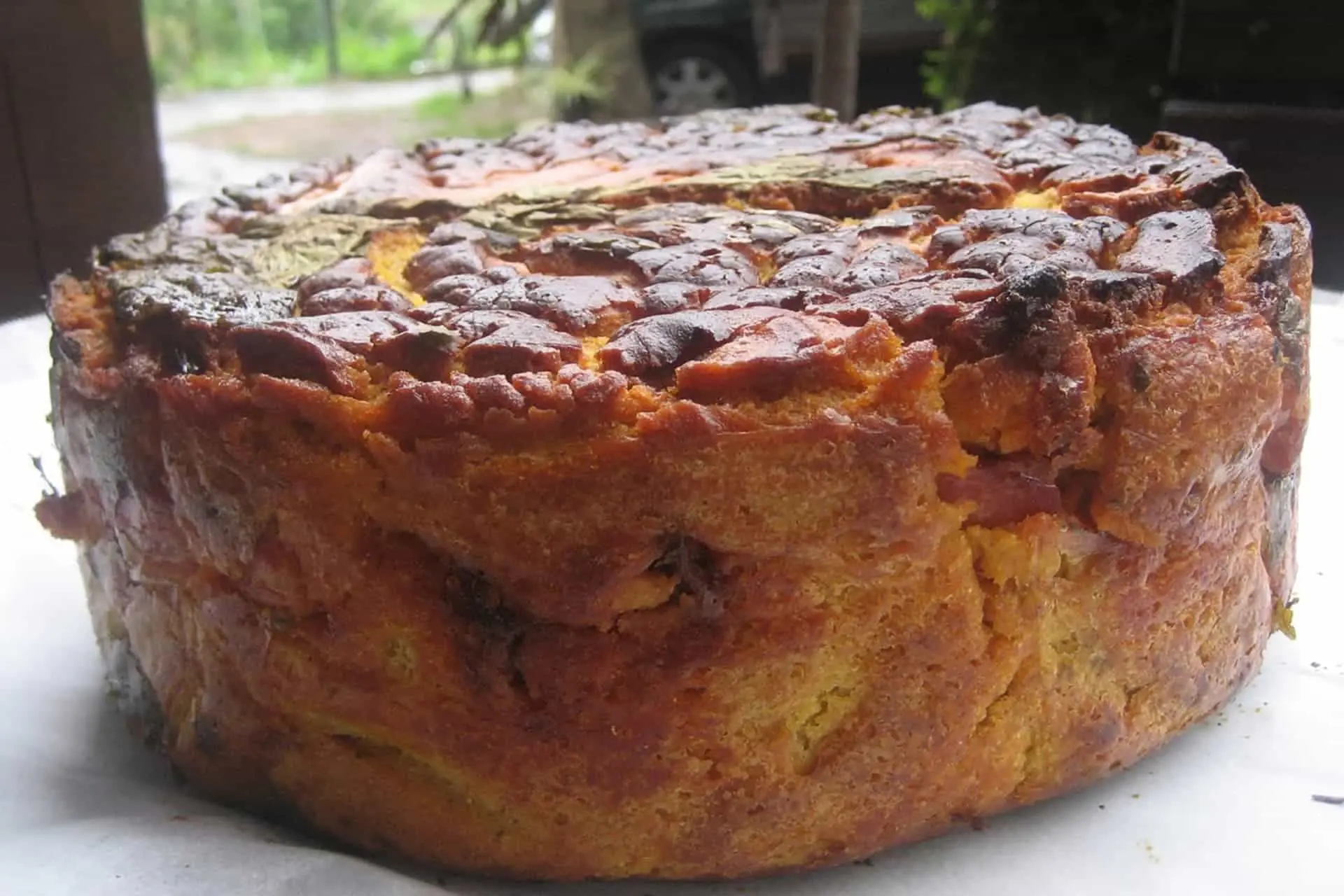 Boroña preñada. Preparación: Se prepara la masa de la boroña, se divide en dos partes, se aplanan un poco. En una de ellas se colocan trozos de chorizo y tocino del jamón. Se cubren con la otra parte y se cuece como la anterior en el h ...